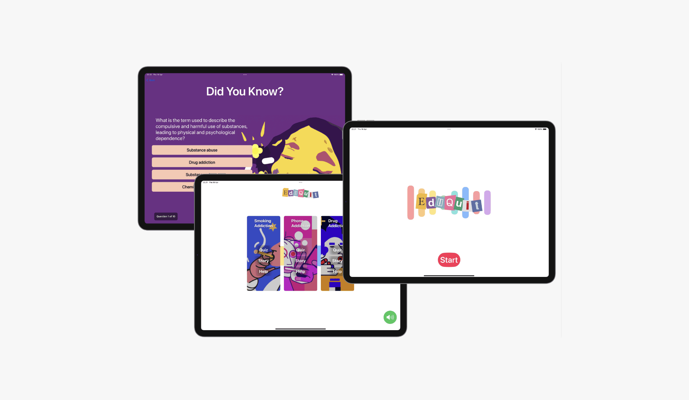 A thorough competitor and market study was also conducted to identify gaps in existing educational apps. This analysis revealed a lack of interactivity and storytelling in similar tools, which became a focus for differentiation in EduQuit. Additionally, scientifically-backed content about addiction was carefully researched to ensure the app delivered accurate and reliable information. Storytelling techniques were incorporated to present the content in a simplified, engaging, and relatable way.